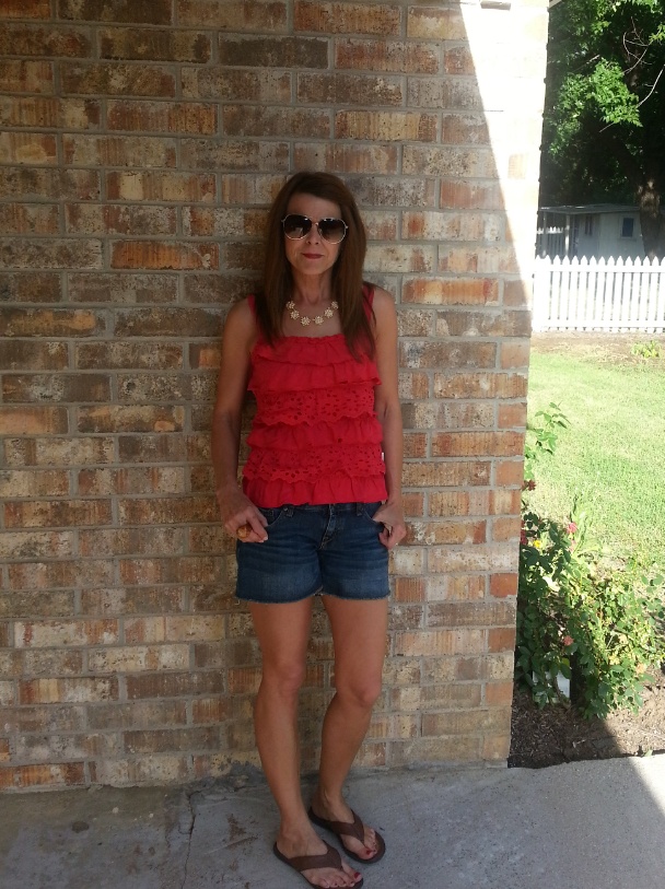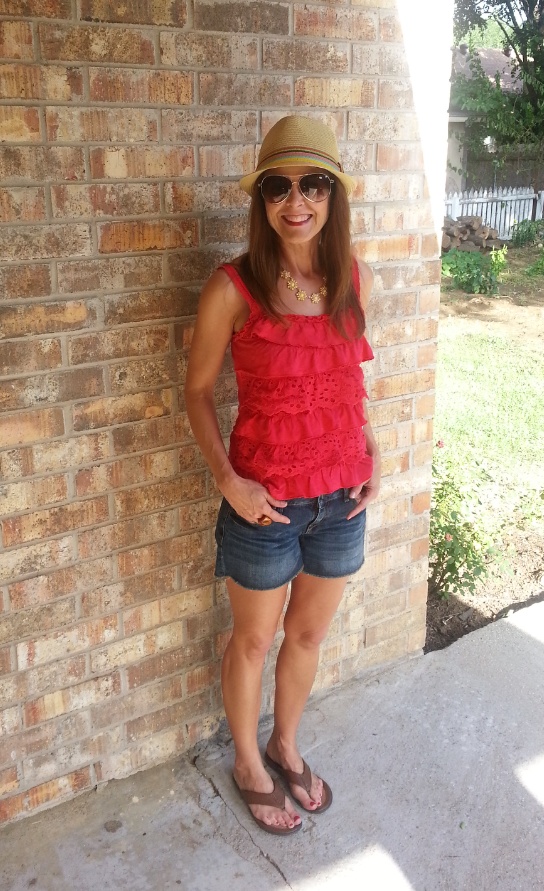 The outfit I remember dates back to about fifth grade. It was a denim print pant and matching jacket. The print with red and yellow flowers and my matching top was red. Matchy-matchy goes way back for me and has been dying a slow death and unfortunately it doesn’t want to die and it rears its head at the worst possible times. My updated version is for summer rather than fall/winter. I paired my denim shorts with a reddish top which I saved from the purge pile {thankfully}! I thought I would add my fedora for a change-up and because during that challenge I didn’t pair it with real clothes. I added a yellow necklace to bring that color in as well.