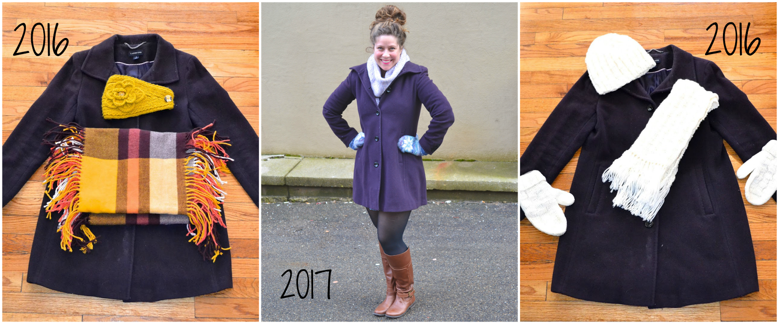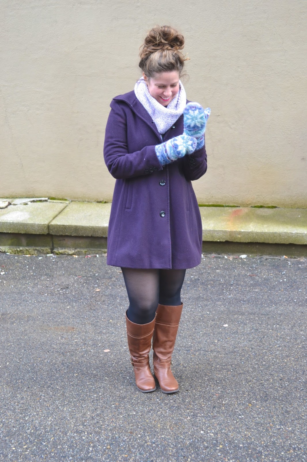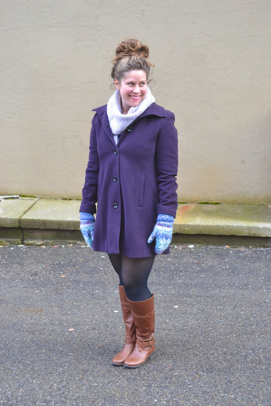 This time around, I went for a monochromatic look using a marled purple scarf and patterned mittens that I bought in Iceland. This is definitely a more elegant look that I would wear perhaps to a nice restaurant or to a show!