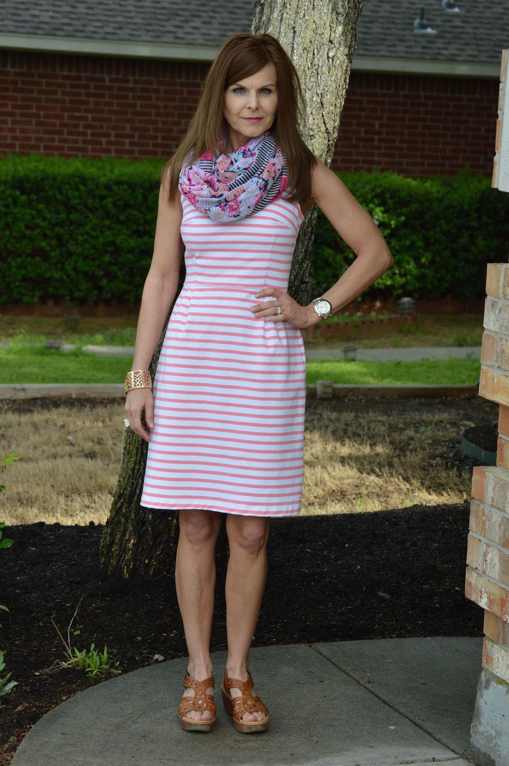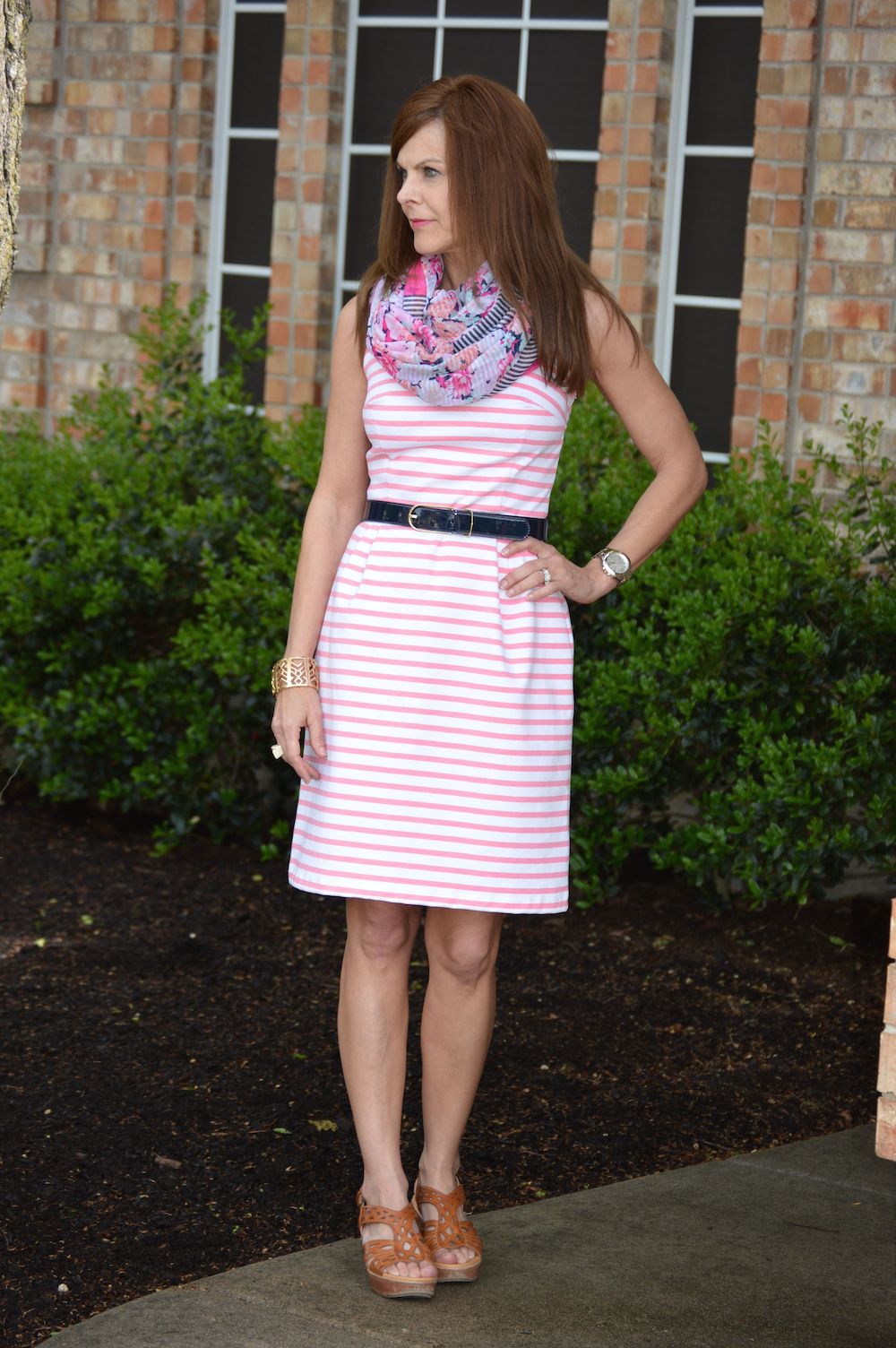 This little scarf works really well with a striped dress which was another item I wanted to add this season. Both embrace pink and I added the navy belt as another option to add color to this look. So here is a look with this scarf but to add interest there is multiple colors and different patterns.
