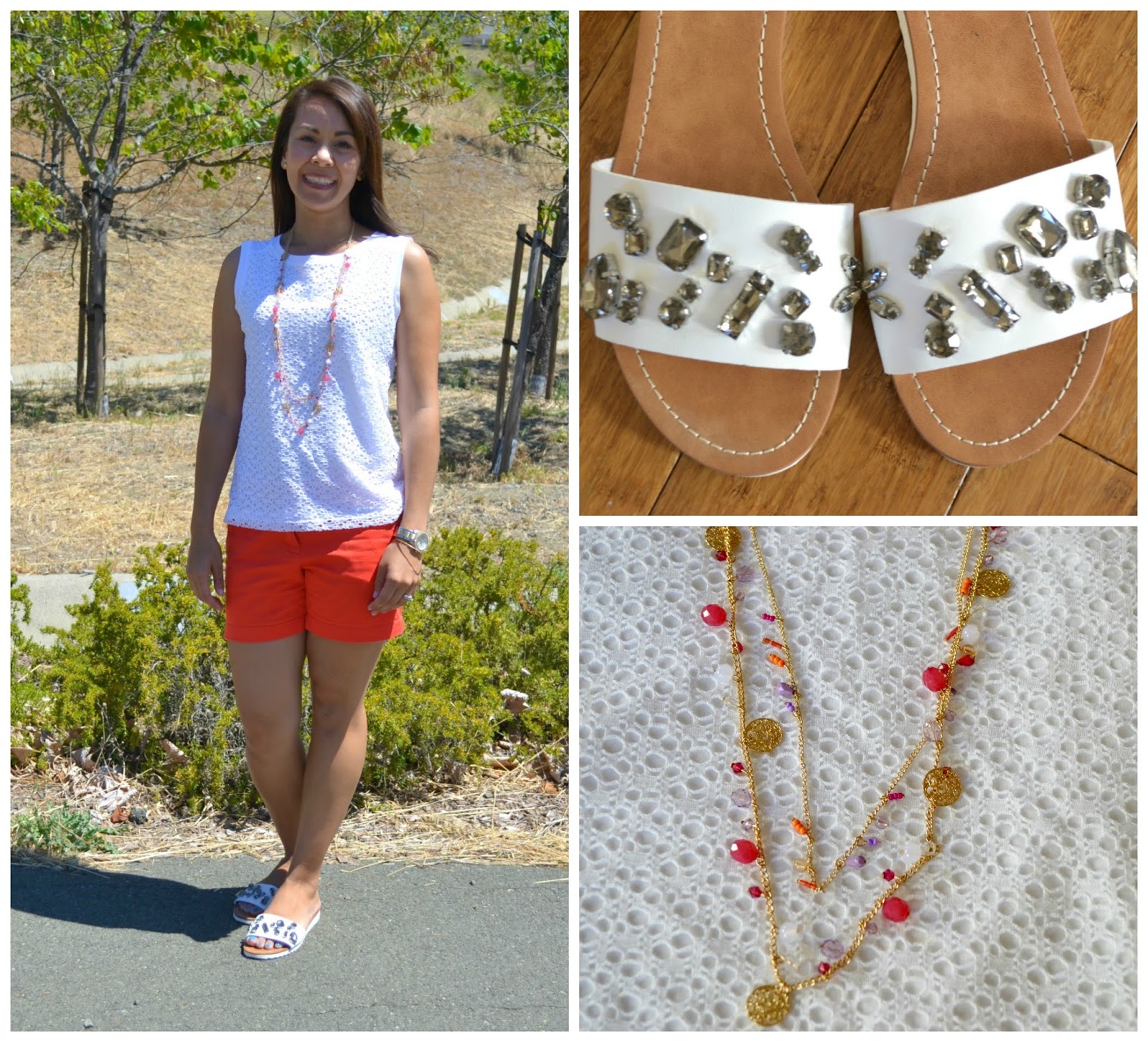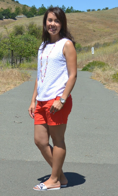 My shorts are electric orange, so I paired it with a simple white top, simple jewelry and some fun sandals. I think it adds just the right amount of bling without being over the top.