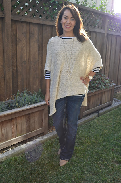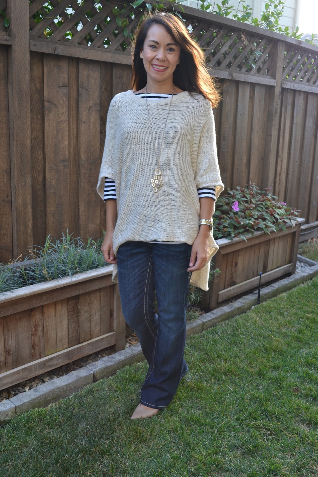 I love the look of flares and I feel they are more-less universally flattering on everyone..my only gripe about them, for me, is they MUST be worn with a heel of some sort. It just has to happen #shortgirlproblems. I also used to think that they always had to be paired with a fitted or structured top, but for fun, I threw on my poncho and gave it a whirl ~