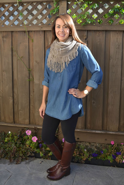 Pretty much as comfy and casual as it gets for fall short of sweats and a big sweater! A chambray tunic and fringe scarf are great casual pieces, but still look polished.