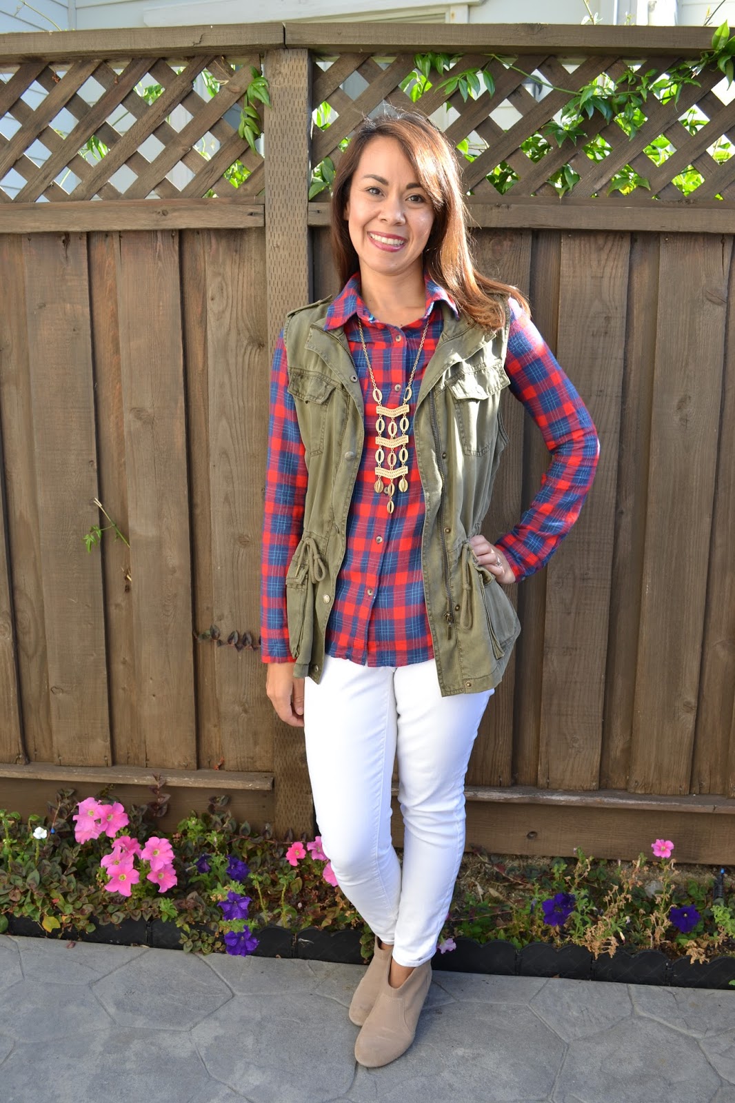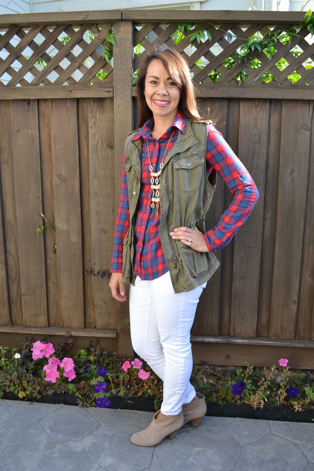 Look #1 ~ Paired with plaid and a cargo vest