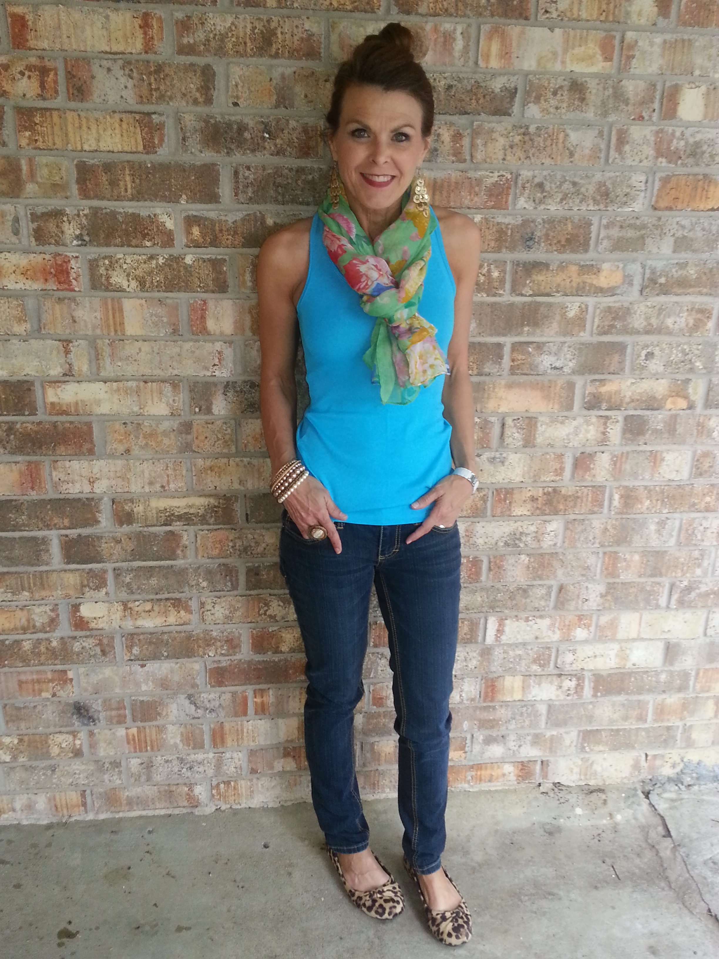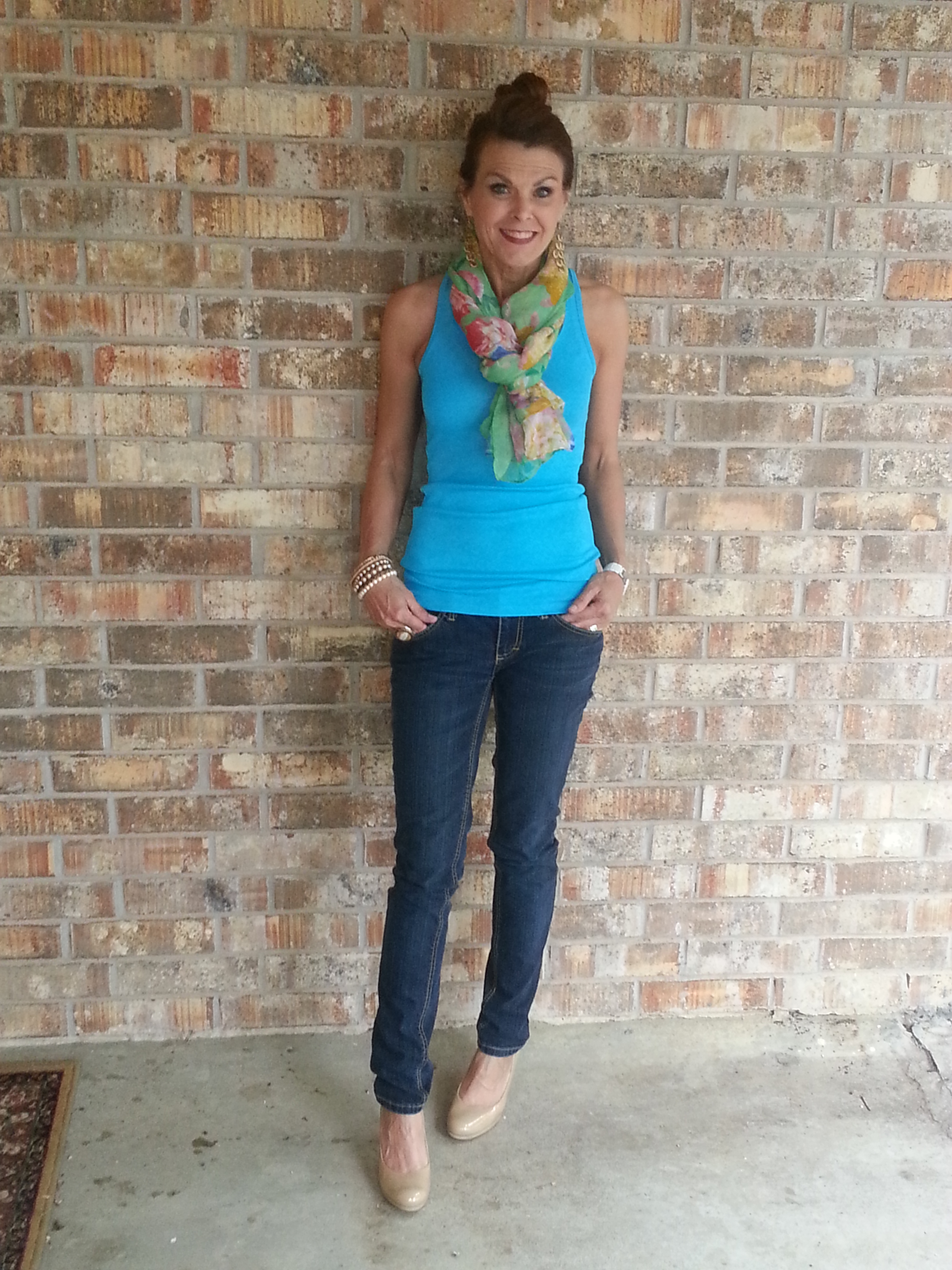 Here’s a couple of looks. Pop of color on top. I am loving this color of blue. Paired it with a scarf and skinny jeans. Switched out the shoes - one look with flats, one look with heels. I like them both but I’m not much of “sexy” girl with skinny jeans and heels. That is another work in process. The hubs? Yeah, he likes that look. {Again, who knew?}