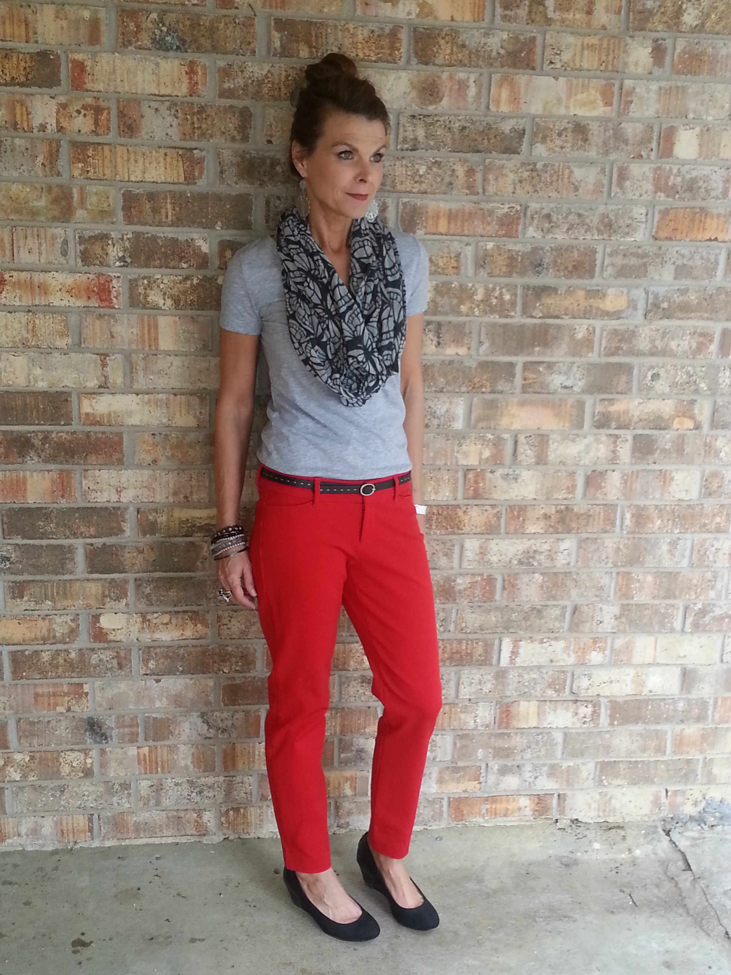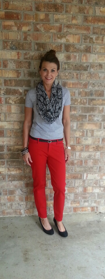 Pop of color on the bottom. Red pixie pants, which I’m getting used to and have worn them a couple of times. Not thrilled with the fit. One size was tighter than I prefer {still have issues with clothes fitting closely to my body} and the another size was just ok. Maybe I should have hung onto my reward $$ for later. But the silver lining is that I do love the color. Color on the bottom and neutral on top and I do like this combo.