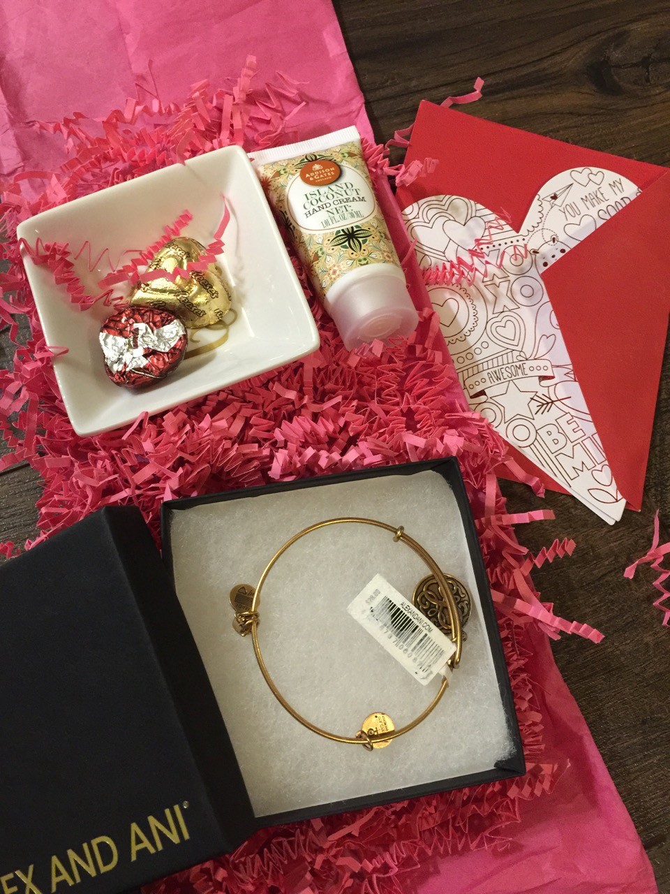 I love chocolate {and there were more but oops again, I ate some before snapping pictures}. The hand cream is on my desk at work and perfect for this time of year. The little dish has my initials, which was super thoughtful. LOVE it! Did Lisa know I have been looking for more bracelets because my collection is pretty awful right now?!
